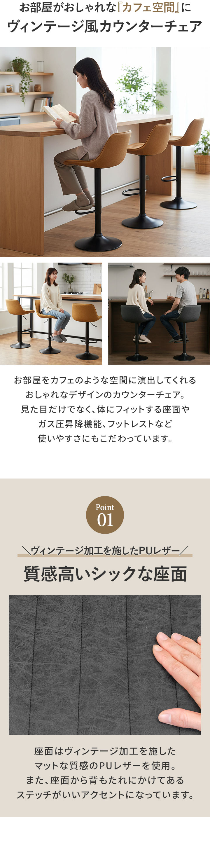 お部屋をカフェのような空間に演出してくれるおしゃれなデザインのカウンターチェア。見た目だけでなく、体にフィットする座面やガス圧昇降機能、フットレストなど使いやすさにもこだわっています。