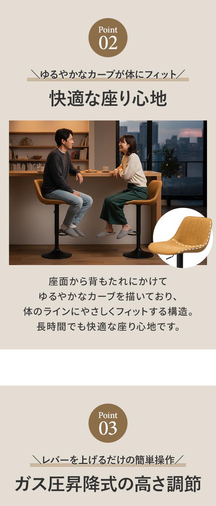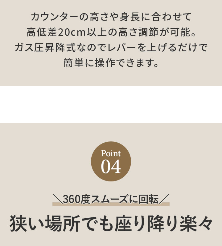 カウンターの高さや身長に合わせて高低差20cm以上の高さ調節が可能。ガス圧昇降式なのでレバーを上げるだけで簡単に操作できます。