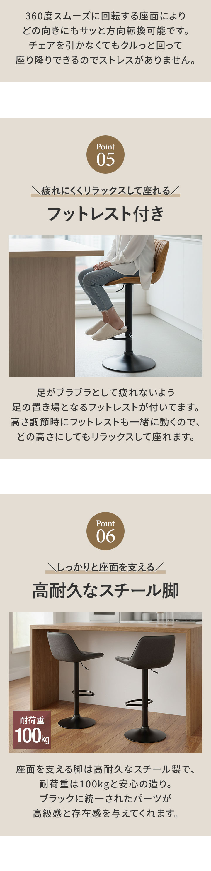 360度スムーズに回転する座面によりどの向きにもサッと方向転換可能です。チェアを引かなくてもクルっと回って座り降りできるのでストレスがありません。