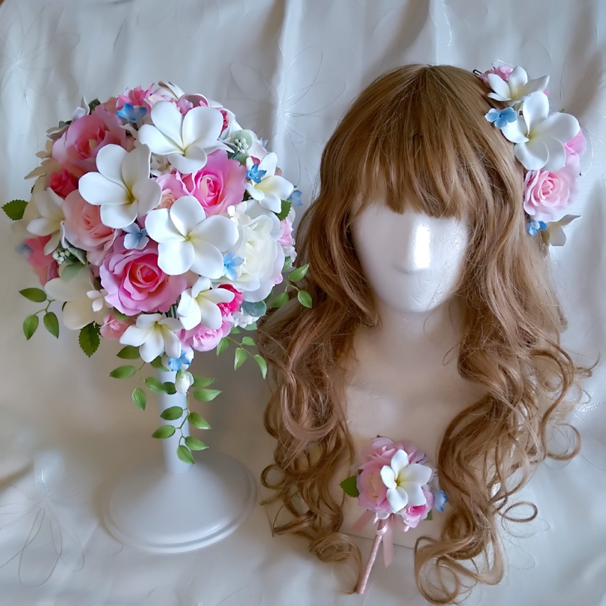 ブーケ 髪飾り ブートニア セット プルメリア ピンク