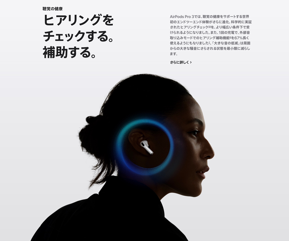 ※2ヒアリングチェック機能は、気導聴覚検査を実施し、難聴を有する可能性をユーザーに通知する家庭用プログラムです。この機能には、iOS 18以降を搭載した対応するiPhone、またはiPadOS 18以降を搭載した対応するiPadとペアリングした、最新のファームウェアを実装したAirPods Pro 2以降が対応します。18歳以上の方による使用を目的としています。聴覚の健康をサポートする機能は変更される場合があります。地域や言語によっては一部の機能を利用できない場合があります。