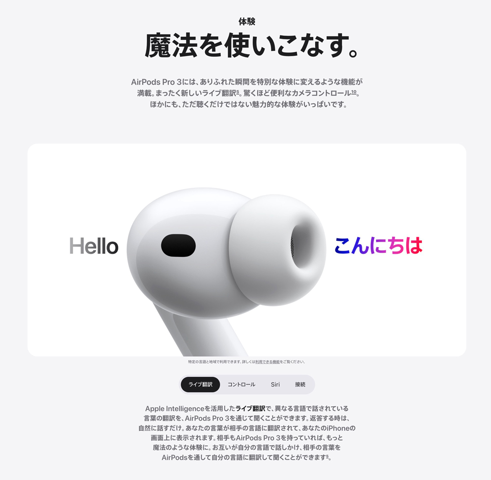 さらに、Apple Intelligenceを活用したライブ翻訳で、異なる言語で話されている言葉の翻訳を、AirPods Pro 3を通じて聞くことができます。