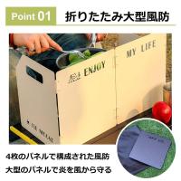 ◆【折りたたみ大型風防】4枚のパネルで構成された大型風防。コの字型に設置でき炎を風から守ります