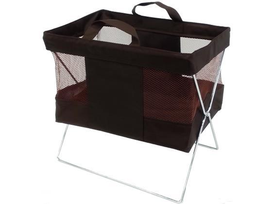 持ち手ハンドル付で持ち運びもラクラクです。●色:ブラウン●ショートサイズ(小)●サイズ:約幅370×奥行250×高さ350(収納袋高さ250)mm●重量:約1.0kg●折りたたみ時サイズ(約):400×480×40mm●材質:袋部分/ポリエステル、PVC、PP、フレーム/スチール(クロームメッキ)●耐荷重:約2.5kg