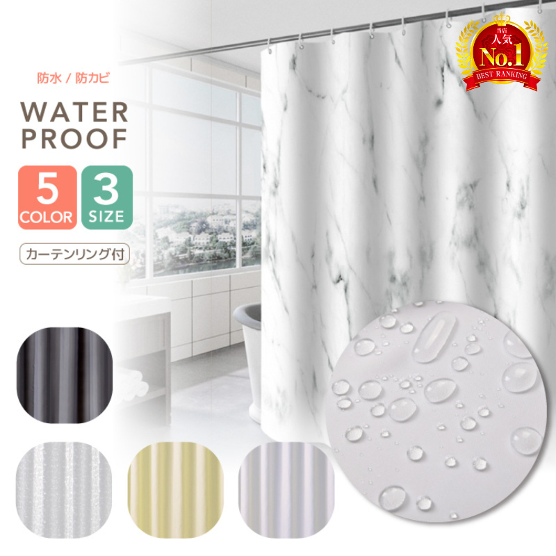 シャワーカーテン 防カビ おしゃれ 透明 北欧 180 防水 撥水 シンプル バス カーテン 浴室 脱衣所 バスルーム お風呂 仕切り カーテンリング付属 ユニットバス
