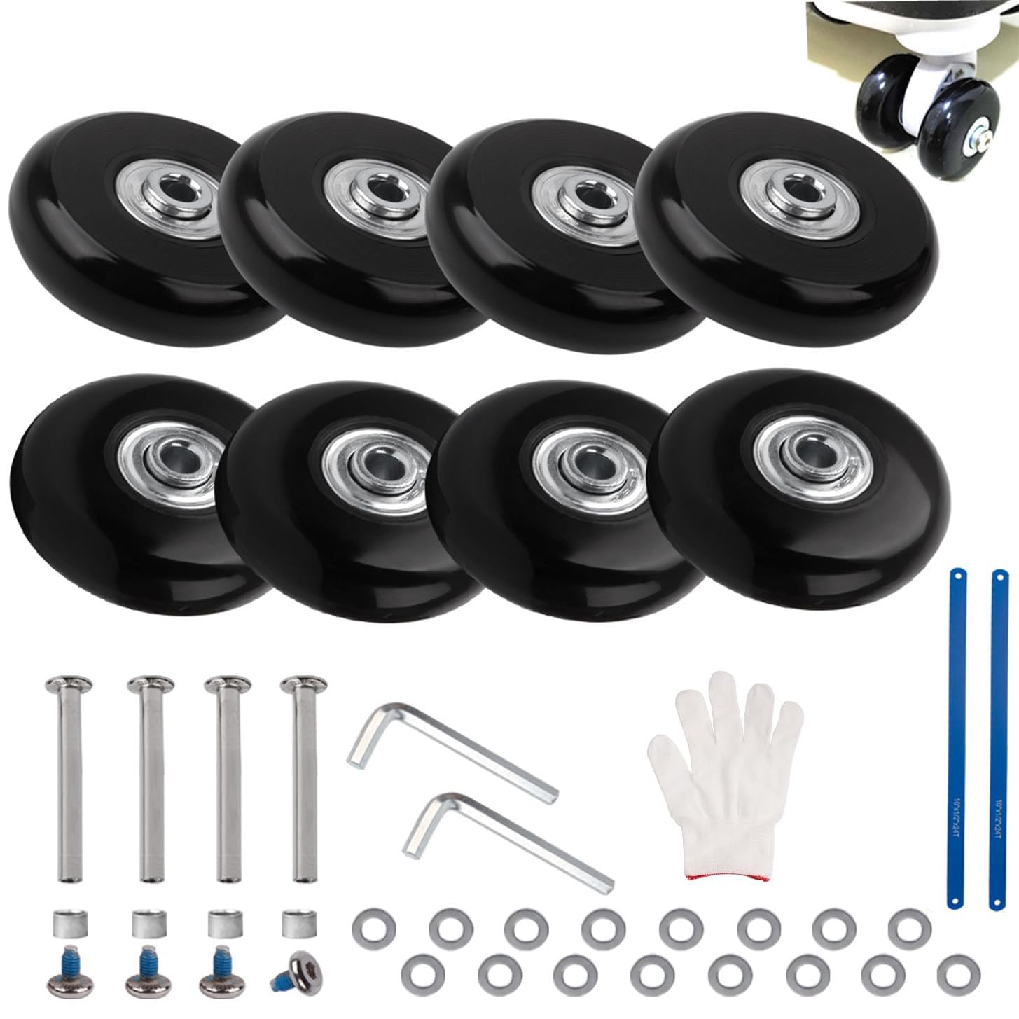 商品名:8個セット スーツケースタイヤ交換キット 車輪補修 静音車輪 キャスター 交換 修理キット キャリーバッグ スーツケース 車輪 DIY 取替え ノコギリ付き (車軸50mm、車輪直径55mm)