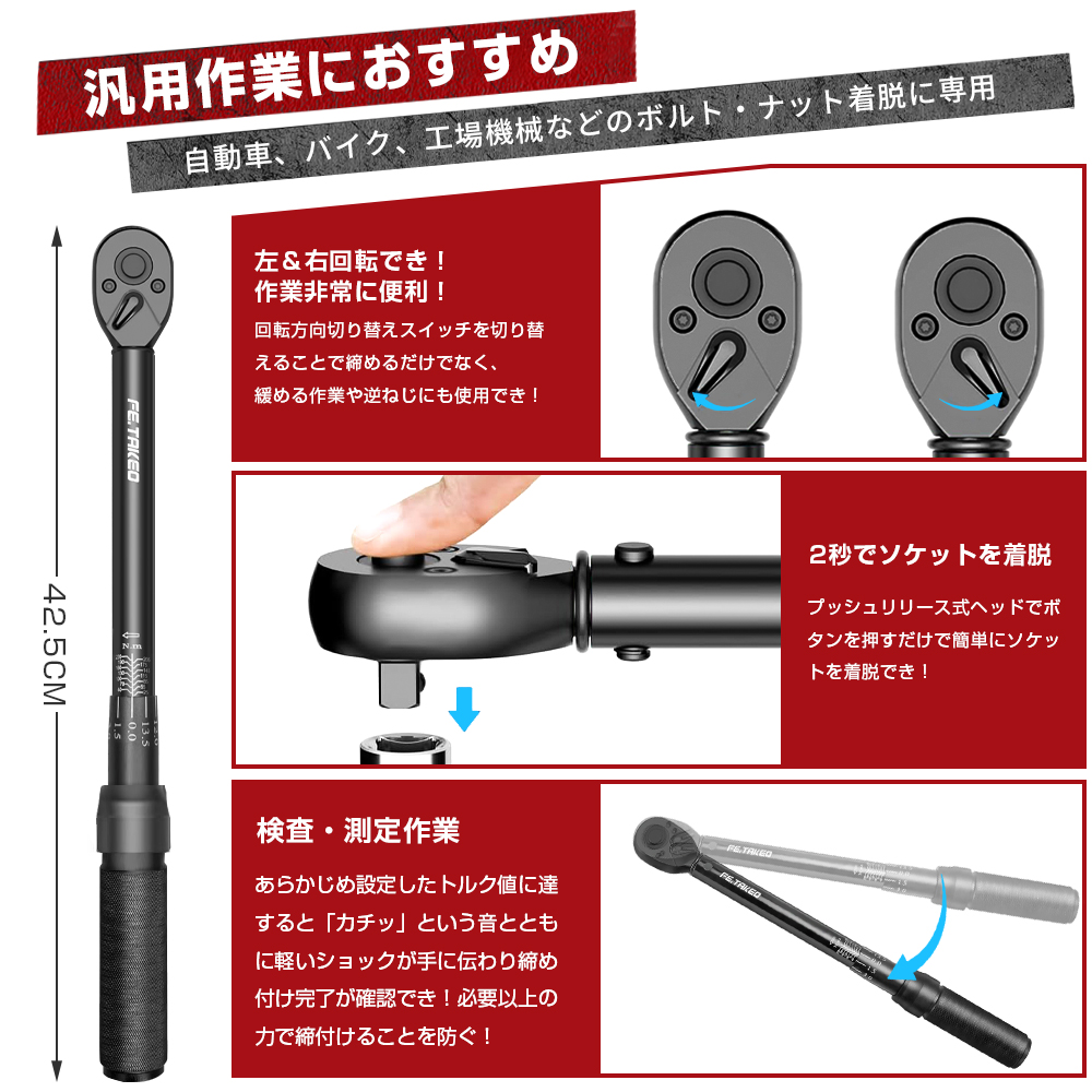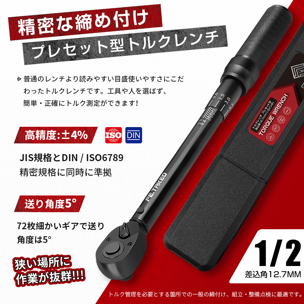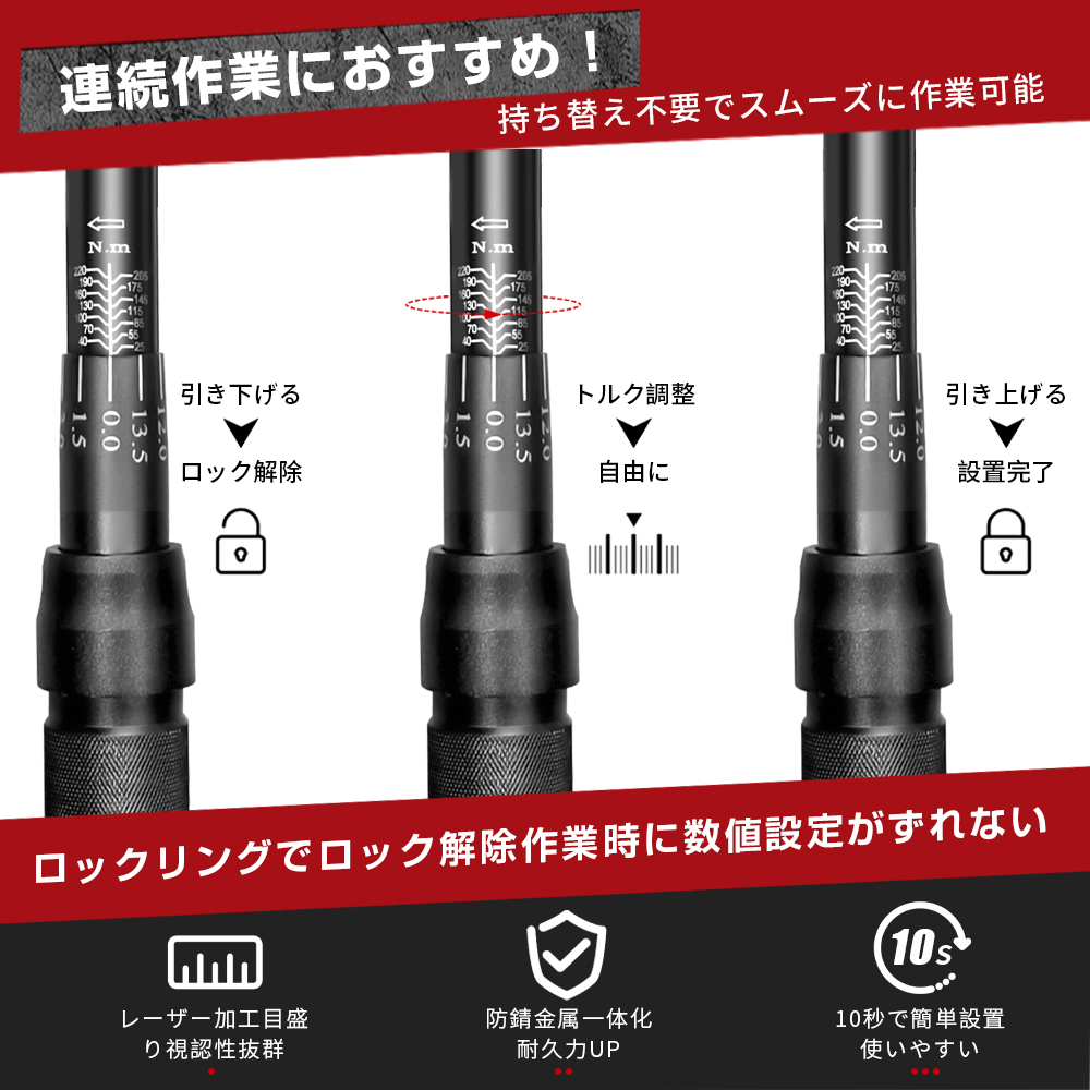 | ■バイクのタイヤ交換やメンテナンスに最適 タイヤ交換などに使用する25-220Nm(ニュートン・メートル)ベーシックなトルクレンチです。 ■プリセット式 トルクレンチ 25-220Nmの範囲で調整が可能な差込角1/2"(12.7mm)のプリセット式 トルクレンチです。 ■はっきり見えるスケールマーク 主目盛と副目盛が記載されており、調整も手軽に可能! ■両回転可 右回転&左回転どちらも回転可能。 ソケットはボタン一つで片手で脱着可能! ■トルク値の設定 手締めでタイヤ交換を行うと、強く締めすぎたり、弱すぎたりすることがありますので、 トルク値の設定を行うことにより適正な締め付けが可能になります。 カチッと手に振動が伝わります。 |
