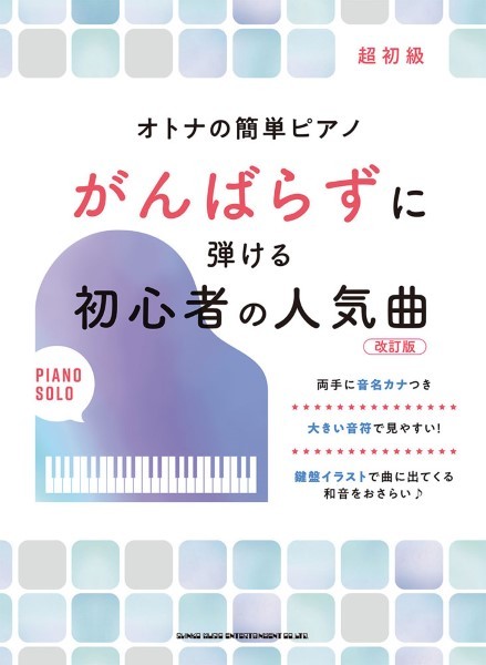 ピアノを独学で始めた方、久しぶりに弾く方にオススメの大人向け楽譜集。やさしいアレンジで、様々なジャンルのヒットソング・名曲が気軽に楽しめます。大きく見やすい譜面で、すべての音符に音名カナ入り。また、各曲冒頭ページには曲に出てくる重音・和音の鍵盤図を掲載し、初心者の苦手ポイントをカバーしています。