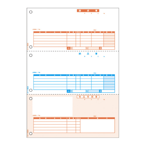 | ●種別/A4(タテ)3分割●サイズ/A4●ファイル穴/6穴(切り離し後:2穴)●ミシン目切り離し後の寸法/ヨコ210×タテ99mm●内容/請求書・納品書・物品受領書●寸法/ヨコ210×タテ297mm●対応プリンタ/レーザー●単位(入数)/500枚●ISO白色度/約83%(ISO方式)●とじ穴/穴間隔(ピッチ)80mm |