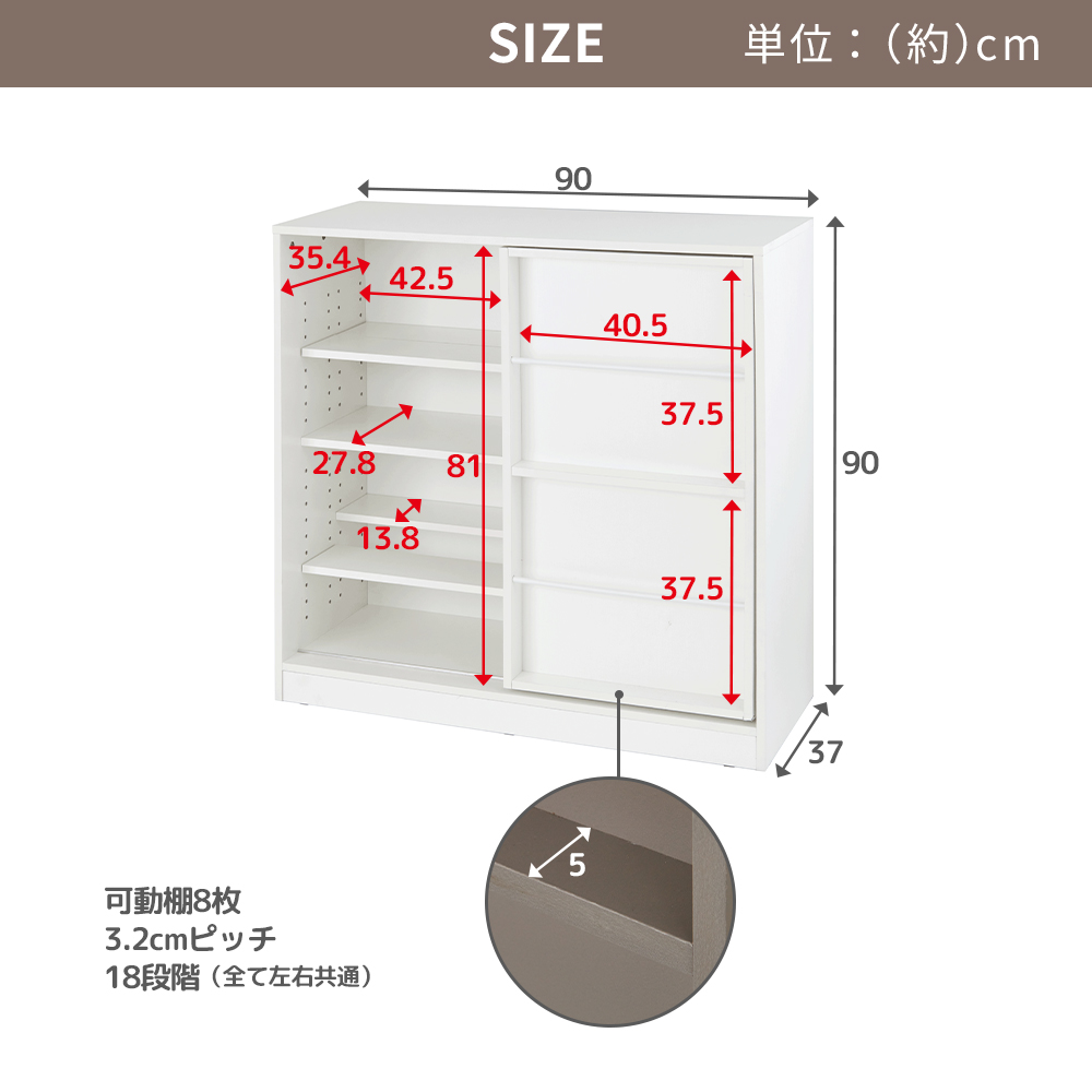 ■サイズ(cm)約/本体:幅90×奥行37×高さ90、固定棚板:幅42.5×奥行27.8×厚み1.5、可動棚板:幅42.5×奥行13.8×厚み1.5、スライドラック:幅43.7×奥行6.5×高さ79.8、ラック部の奥行:5