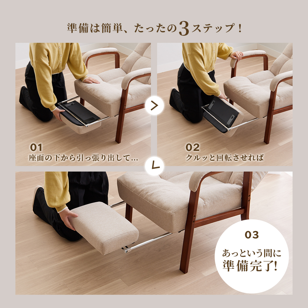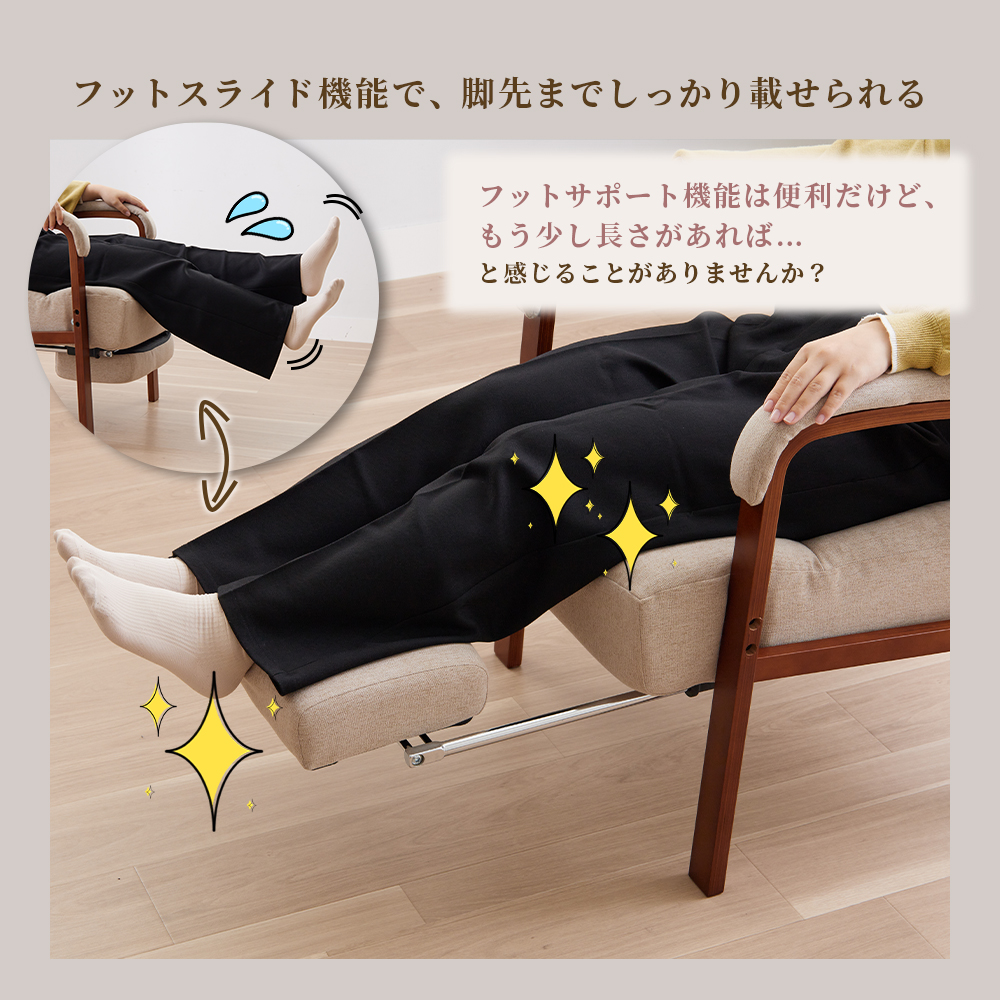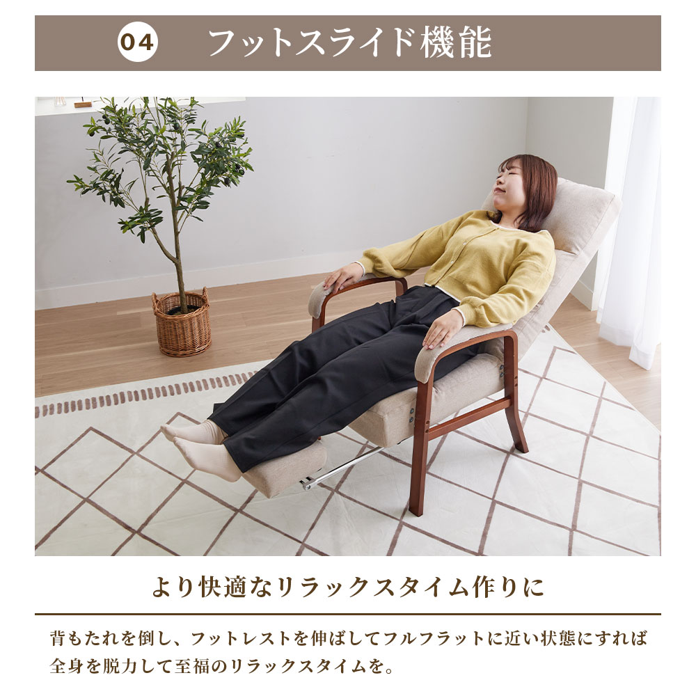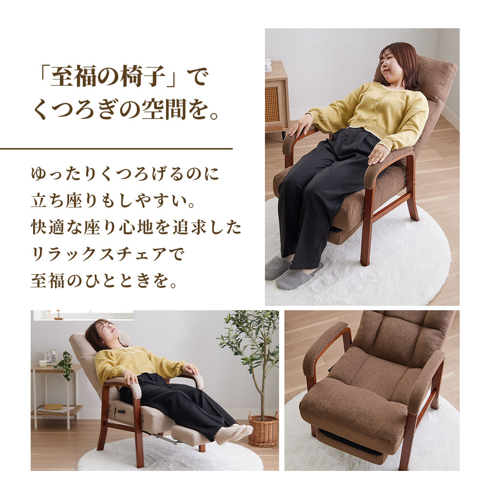 脚を伸ばしてゆったりくつろげる!調整できるフットレスト付で、自分にあったリラックス空間を作れます。サイドレバー式で座ったまま角度を調整OK。プレゼントにもおすすめ。