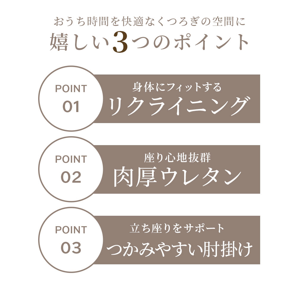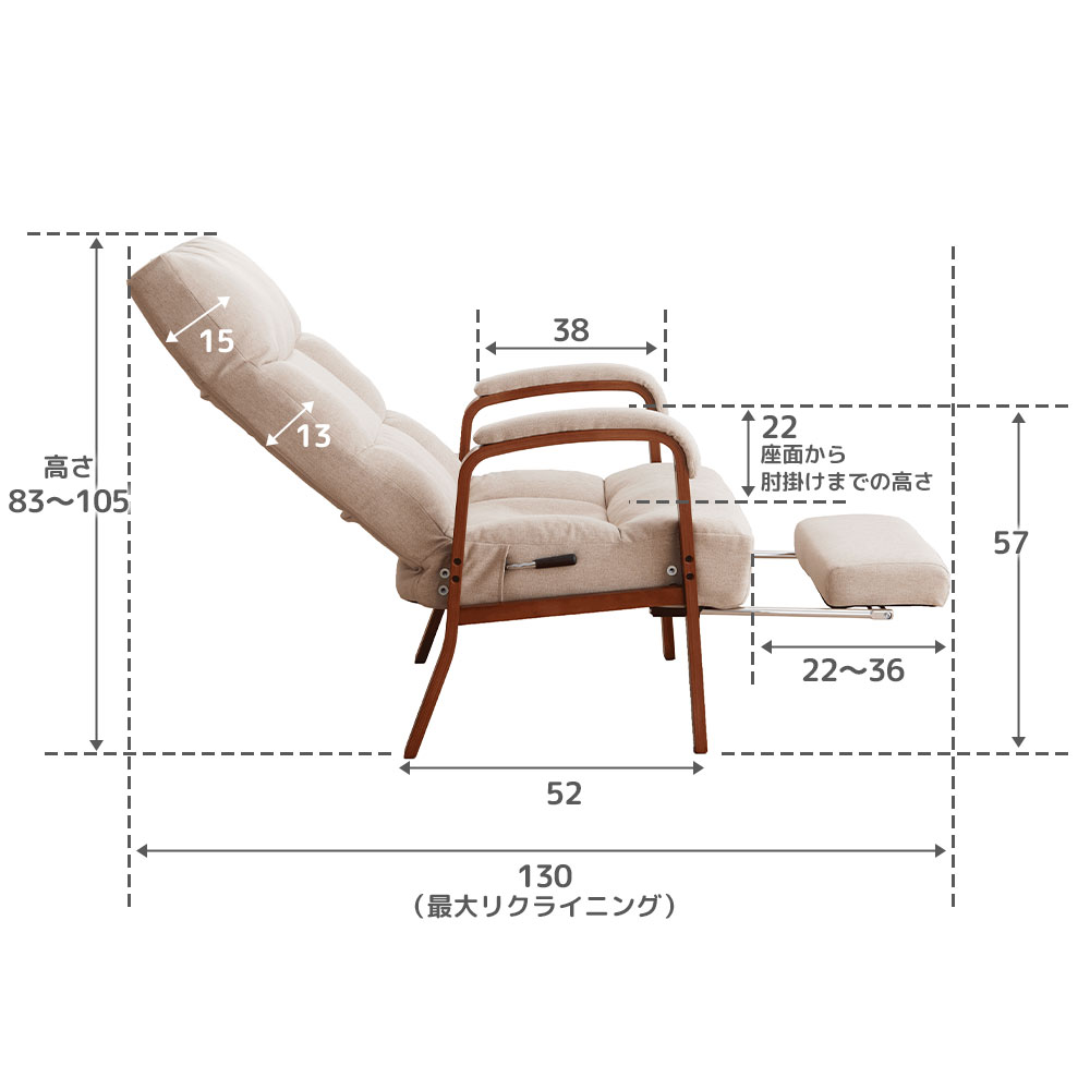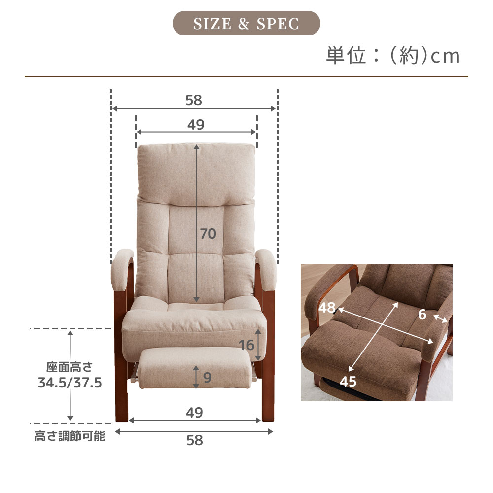 ■品質/表地:ポリエステル、裏地:ポリエステル、詰め物:ウレタンフォーム・ポリエステルわた、肘掛部:天然木合板(表面ラッカー塗装)、フレーム:【本体】金属(鋼)【フットレスト】金属(鋼)・ナイロン