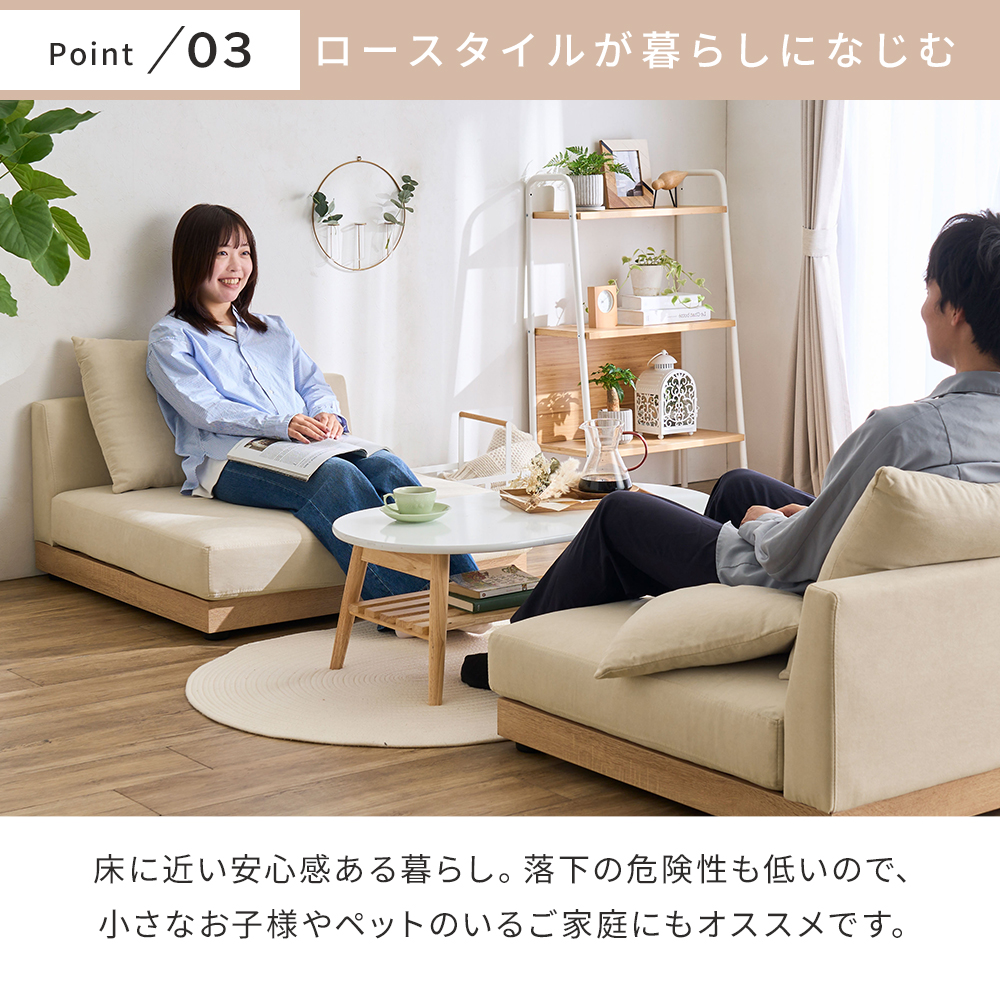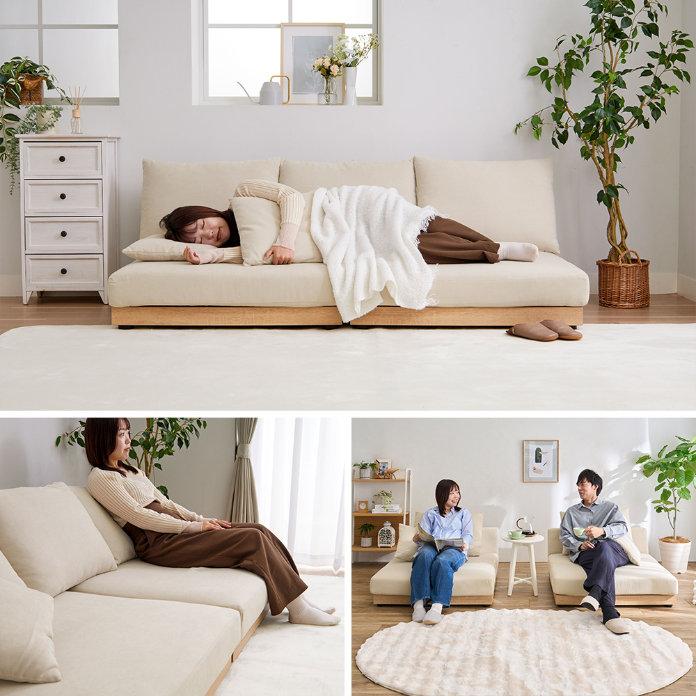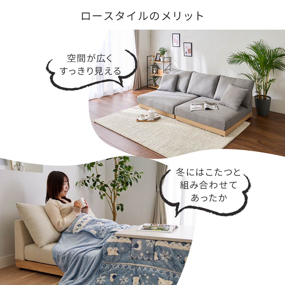 ナチュラル感のある木飾りがアクセントになりおしゃれ。お部屋が広く感じる、ロータイプのソファ。