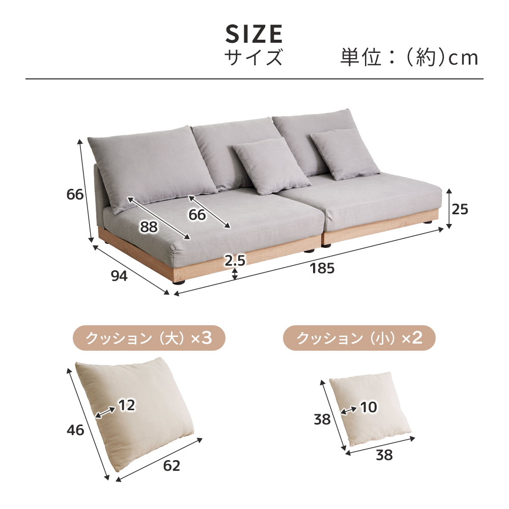 ■サイズ(幅×奥行×高さ/約cm)/1個あたり:92.5×94×66、セット時:185×94×66、座面の高さ25、クッション(大):62×46×12、クッション(小):38×38×10