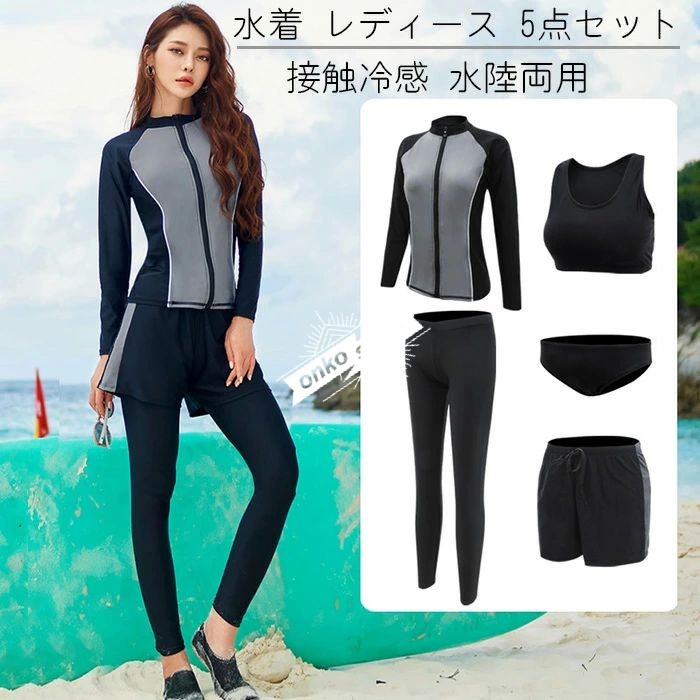 水着 レディース 5点セット フィットネス水着 長袖ラッシュガード 体型カバー セパレート ショートパンツ タンキニ オシャレ UVカット 接触冷感 水陸両用 ソフト