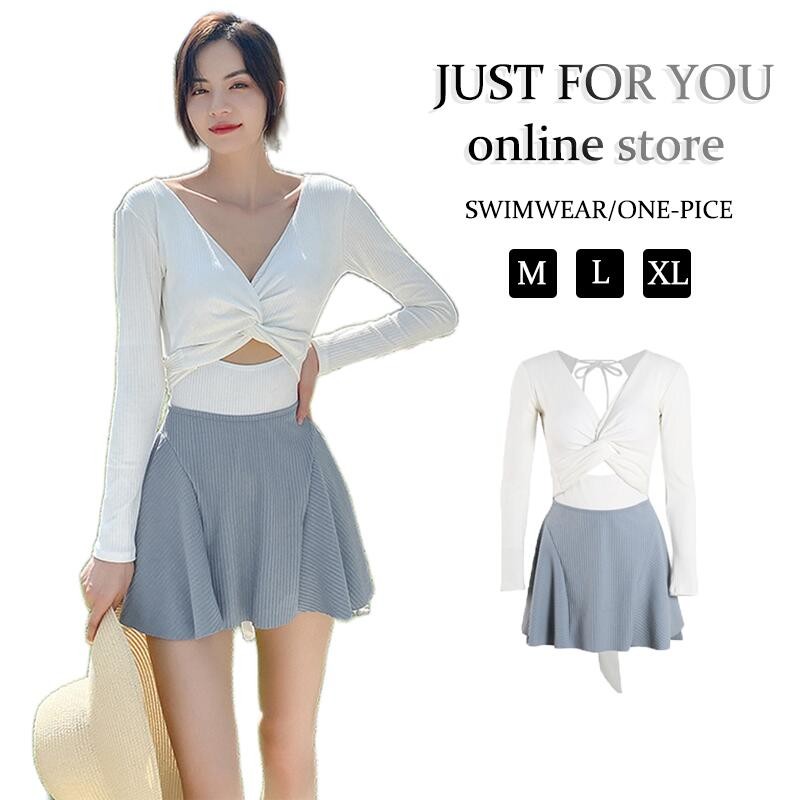 ホワイト グリーン 水着 レディース ワンピース 長袖 オールインワン 長袖ワンピ 露出控えめ クロスデザイン Vネック ワンピ水着 パッド付き 連体水着 夏用 ショ