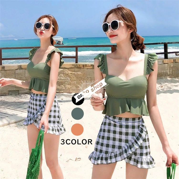 レディース セパレート 水着 ビキニ 水着 高校生 ビスチェ水着 韓国 体型カバー 盛れる フリルスカート チェック柄 着痩せ 小胸 タンキニ水着 セットアップ 黒/