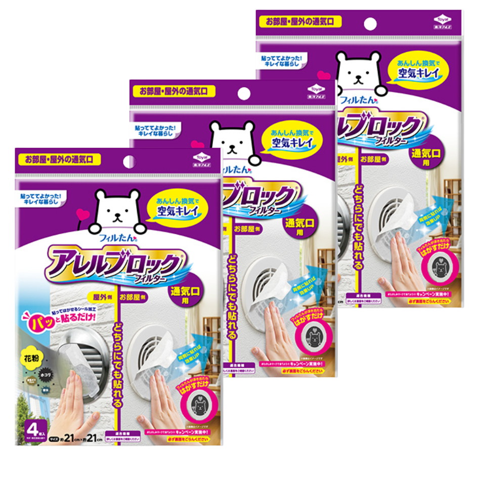 【3袋計12枚】東洋アルミ アレルブロックフィルター 通気口用 約21×21cm 4枚入 お部屋と屋外の通気口兼用 パッと貼るだけ 通気口フィルター sj