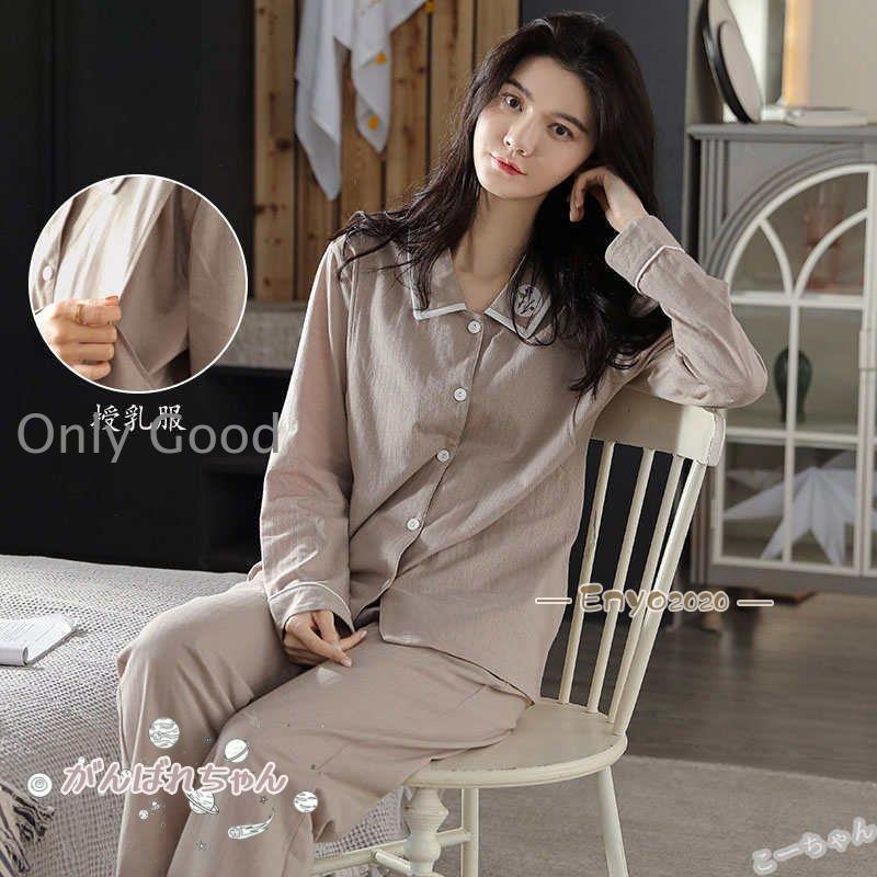 マタニティ パジャマ 長袖 前開き 授乳口付き ストレッチ 長ズボン 春 夏 秋 無地 ウエスト調整パンツ ポケット付き 産前 産後 授乳 育児 ガーゼ