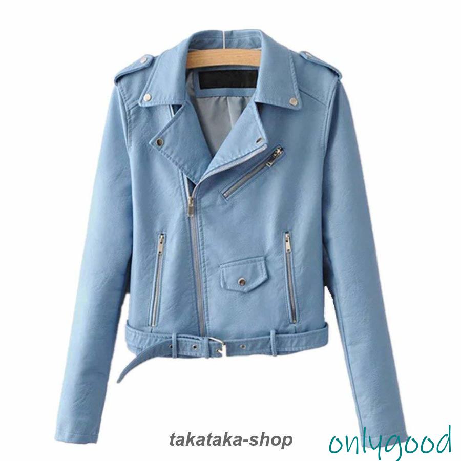 レザー ダブル ライダース ジャケット アウター レディース 革ジャン ショート丈 ウエストベルト フェイクレザー ベーシック シンプル カジュアル 春 秋 春服 秋服 20代 30代 40代 ブルー イエロー ワインレッド ピンク ブラック