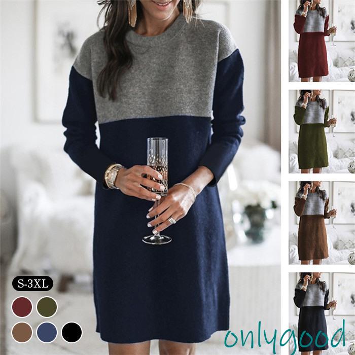 ワンピース レディース 長袖 膝上 丸襟 配色 大人 上品 ハイウエスト 大きいサイズ 着痩せ お洒落 40代 カジュアル 通勤 OL 秋 シンプル