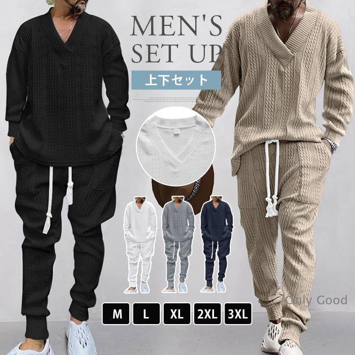 上下セット メンズ 秋 冬 セットアップ ニット ジャガード ルームウエア 無地 長袖 Vネック ロング丈 ロングパンツ ウエスト