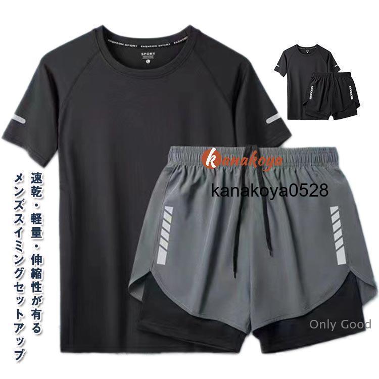 大きいサイズ スポーツ水着 パパ セット かっこいい グレー tシャツ セットアップ 半袖 メンズ ショートパンツ 大きいサイズ 海パン 男性用 上下