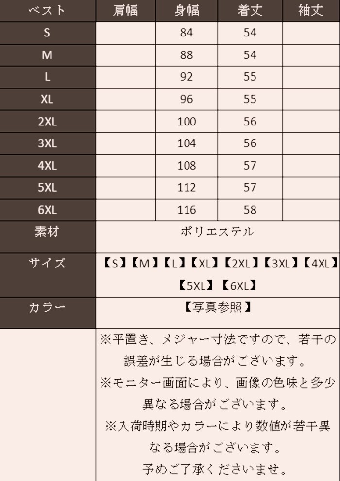 サイズ:【S】【M】【L】【XL】【2XL】【3XL】【4XL】【5XL】【6XL】