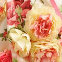 綿生地の可愛い柄のドレスです。胸元からスカート部分にかけてたっぷりの造花とリボンがあしらわれたキュートなドレスになります。
