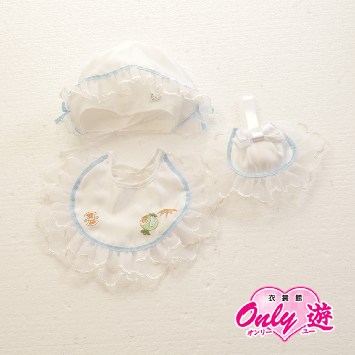 お宮参りに必要なよだれかけ、帽子、お守りの3点セット