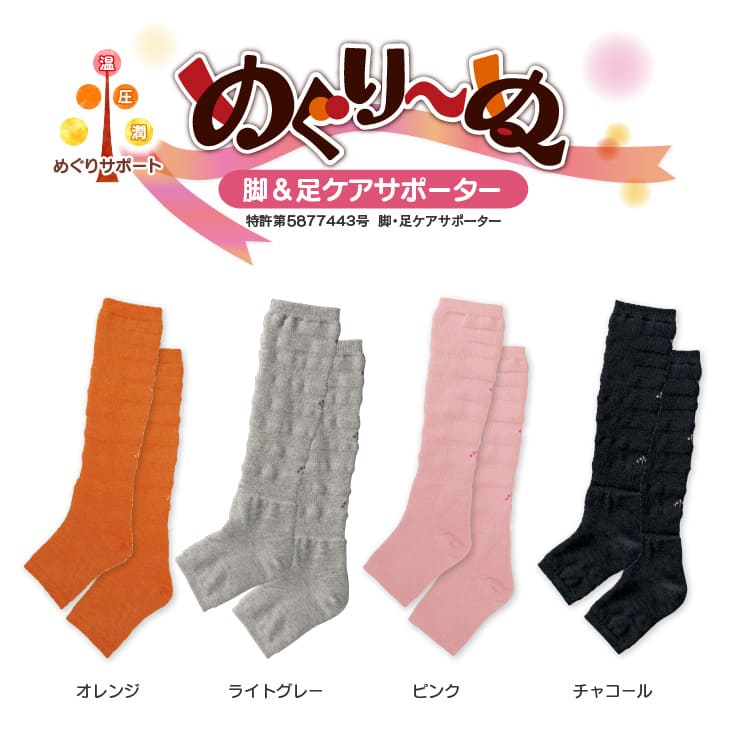 冷え・疲れ・かかとのガサガサ足のストレストラブル全部いっぺんにケアできるサポーター。締め付けすぎない着圧を実現!通常の着圧ソックスとは違い、温めることでやさしく『めぐり』を助けます。パイルの「温」と弾力糸の「圧」を、幅と強さを変えながら《温・圧・温・圧…♪》と、リズミカルに繰り返します。下から上へ向かう、ほっこりとした温かさとやさしいサポート力を感じてください。
