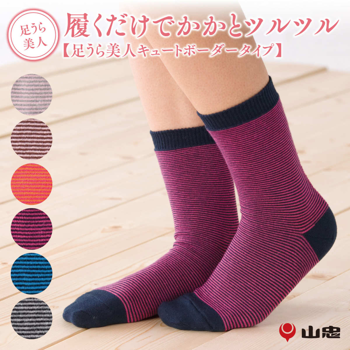 靴下 足うら美人キュートボーダータイプ かかとケア靴下 かかと 角質 保湿 がさがさ つるつる うるおい 靴下 プレゼント 母の日 日本製 山忠 温むすび
