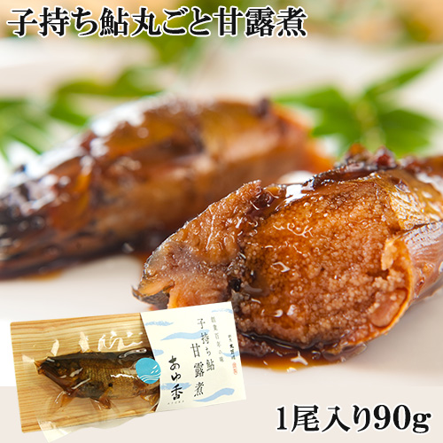 卵がたっぷり入った鮎の甘露煮です。丸1日煮込んでふっくらとした仕上がりです。頭から骨までやわらかく食べられます。ごはんのおかずにぴったりです。大分県の河川のうちでも清流を誇る大野川の渓谷の中で犬飼付近に育つ鮎は、最たる鮎として昔より遠く県外の方々に季節の川魚として喜ばれてきました。一世紀も昔から、この地方では川魚の甘露煮を作り、独自の味を自慢する風習が有ります。