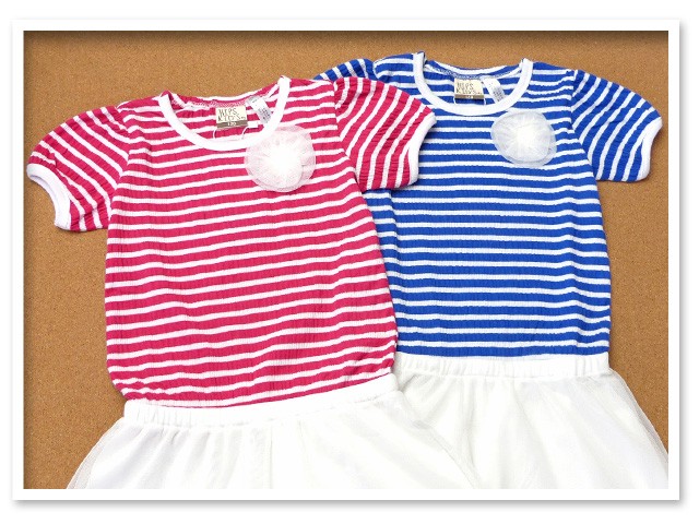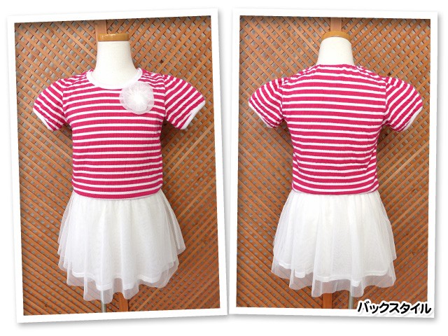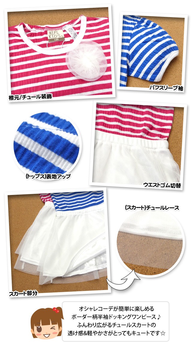 子供服 女の子 ドッキング ワンピース 半袖 重ね着風 ボーダー チュールレース 女児 キッズ 100cm 110cm 120cm 130cm メール便OK