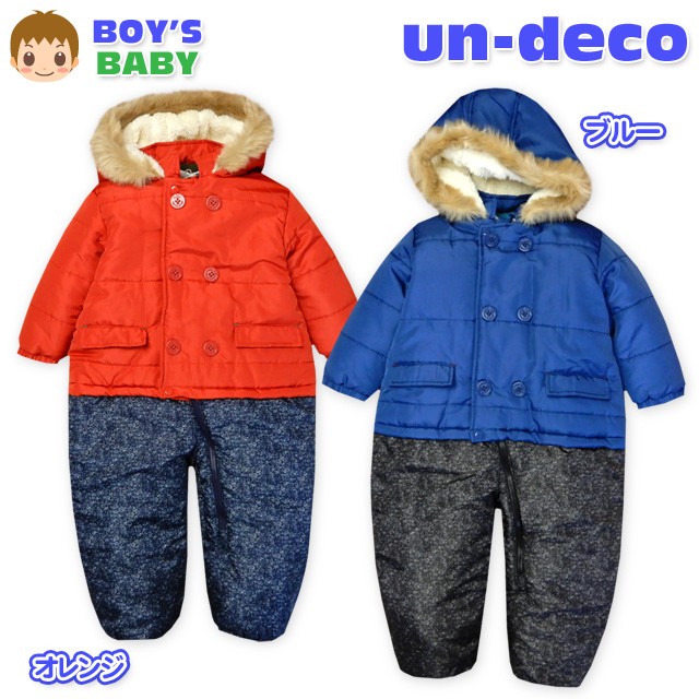 | 特長 | ・un-deco(アンデコ) ・中綿ジャンプスーツ/ スノーコンビ ・撥水加工 ・ファー付きフード ・裏フリース(袖部分除く) ・フード裏ボア切替 ・比翼ジップ ・イカリボタン装飾 ・デニム風切替 ・ポケット2P ・ファスナーガード ・袖口ゴム入り ・裾二重構造/内側ゴム入り ・子供用 ・男の子 |