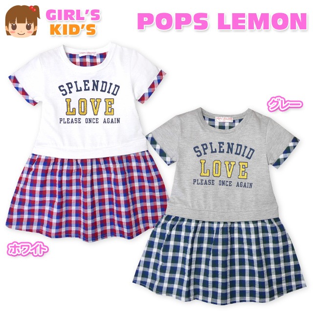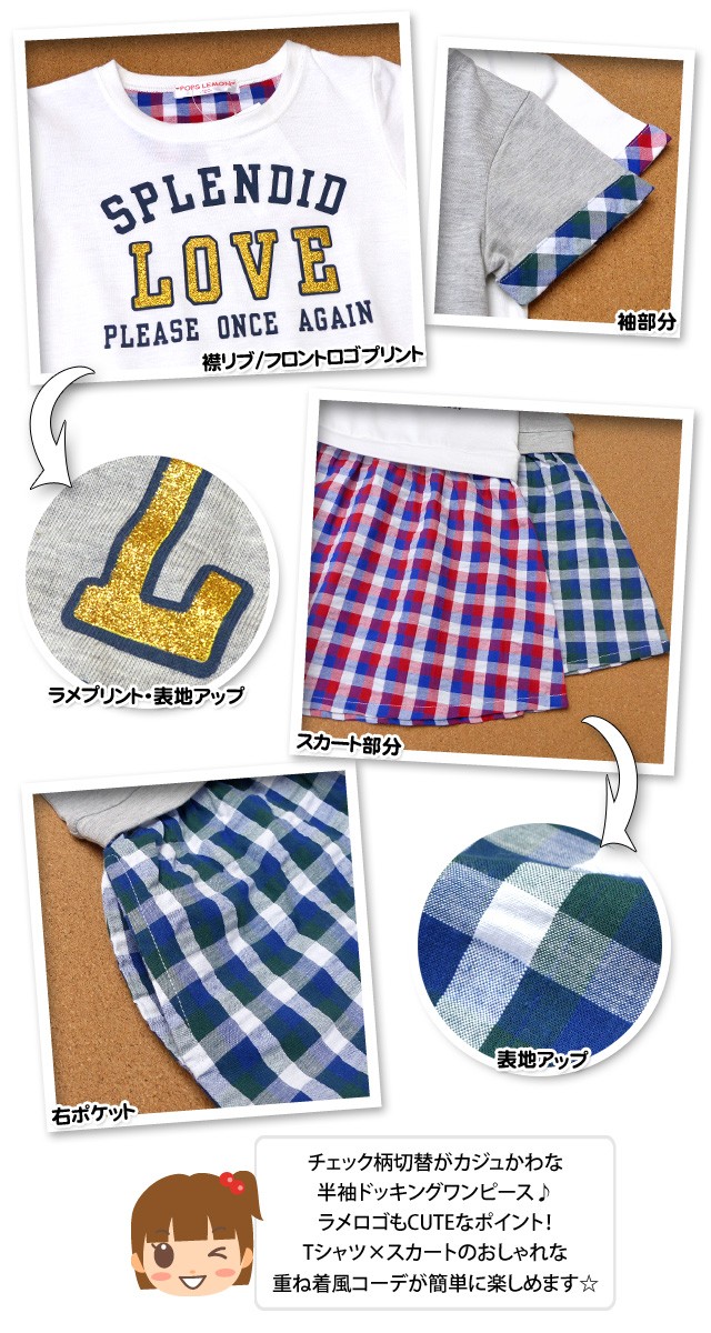 子供服 女の子 ドッキング ワンピース 半袖 重ね着風 チェック柄 ラメ ロゴプリント 女児 キッズ 110cm 120cm 130cm メール便OK