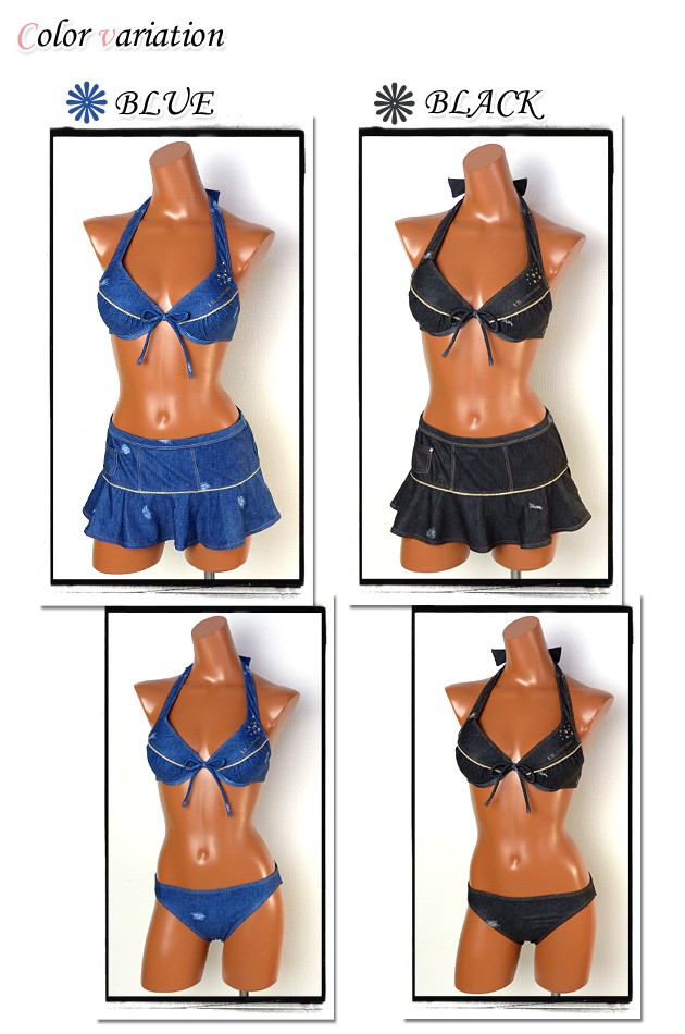 レディース 水着 スイムウエア LB by LOVE BOAT ラブボート ホルタービキニ 3点セット スカート付 デニム風 7Sサイズ 9Mサイズ 11Lサイズ