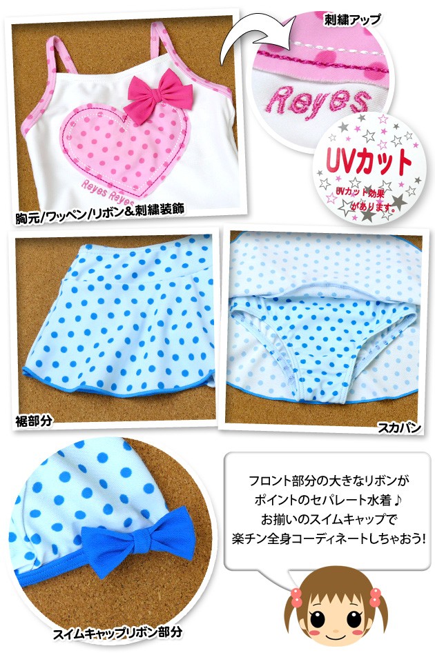 子供 水着 スイムウエア 女の子 セパレート タンキニ 3点セット UVカット ドット柄 スイムキャップ付き リボン&刺繍装飾 女児 ベビー 80cm 90cm 95cm メール便OK