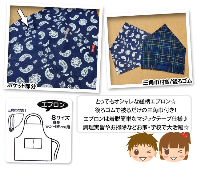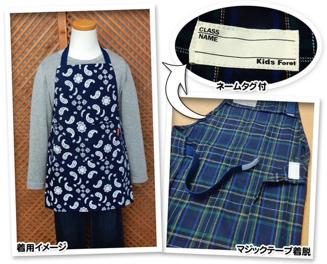 | 特長 | ・Kids Foret(キッズフォーレ) ・エプロン ・三角巾付き ・チェック柄 ・ペイズリー柄 ・ネームタグ付 ・ポケット付 ・ゴムひもマジックテープ留め ・子供用 ・男の子 ・女の子 |