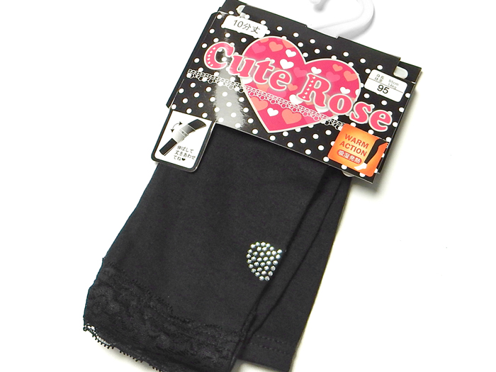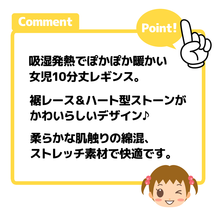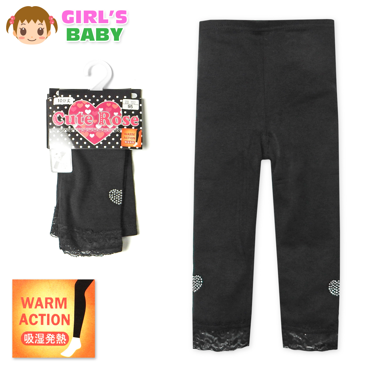 送料無料 女児 ベビー 吸湿発熱 レギンス 10分丈 あったか 裾レース ハートストーン ボトムス ベビー服 女の子 90cm 95cm 3bb-871a メール便対応