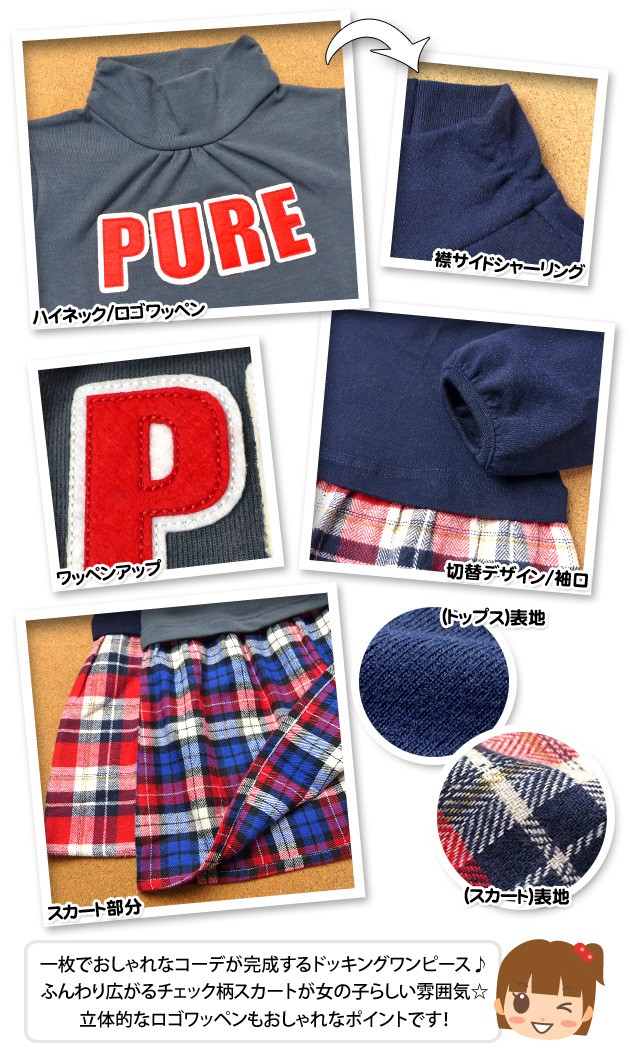 子供服 女の子 ドッキング ワンピース 長袖 ハイネック ロゴワッペン チェック柄 女児 キッズ 110cm 120cm 130cm メール便OK