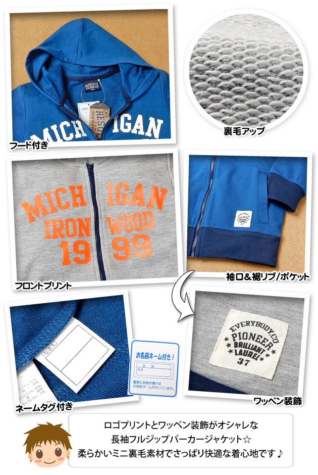 送料無料 子供服 男の子 アウター フルジップ パーカージャケット ミニ裏毛 ワッペン装飾 ネームタグ付き 男児 キッズ 110cm 120cm 130cm メール便対応
