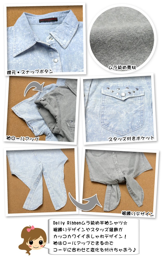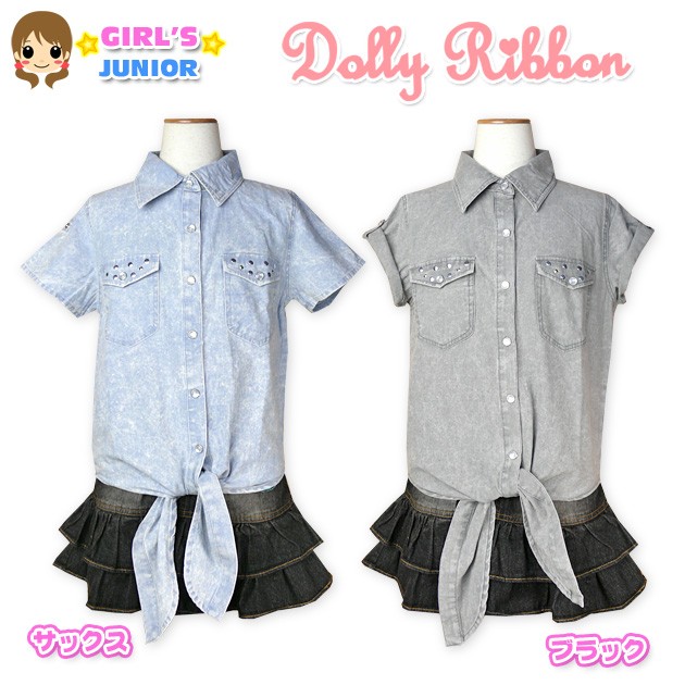 送料無料 子供服 女の子 シャツ 半袖 Dolly Ribbon ムラ染め 綿100% 袖ロールアップ 裾縛り スタッズ 女児 ジュニア 150 メール便対応