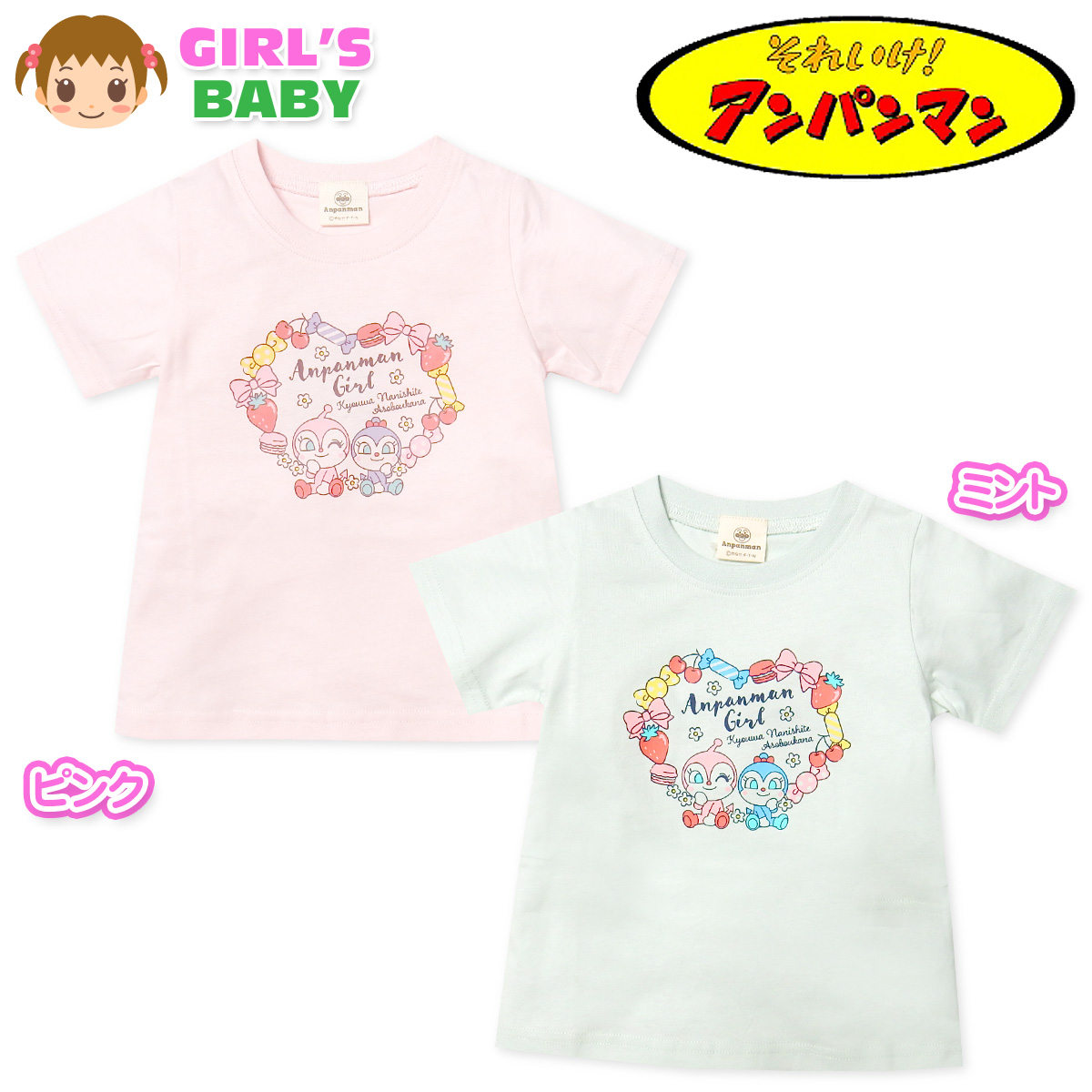 送料無料 女児 ベビー 綿100% 半袖 Tシャツ アンパンマン ドキンちゃん&コキンちゃんプリント ネームタグ 女の子 iw-1111 メール便対応