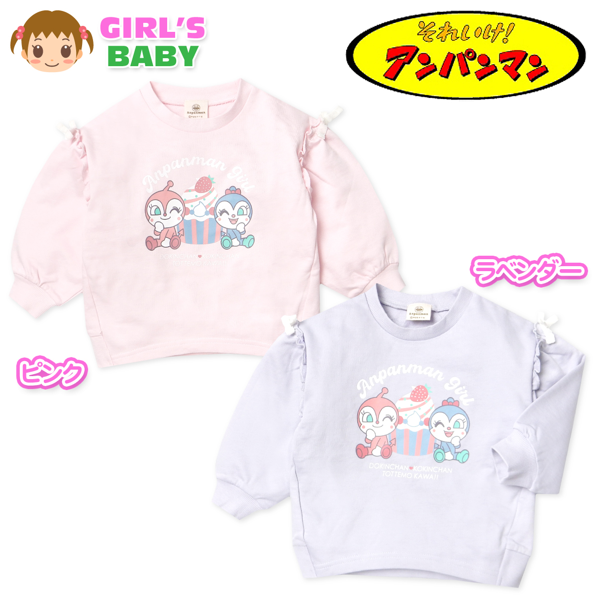 送料無料 女児 ベビー 裏毛 長袖 スウェットシャツ アンパンマン 本体綿100% ドキンちゃん&コキンちゃん フリル リボン iw-1191 メール便対応
