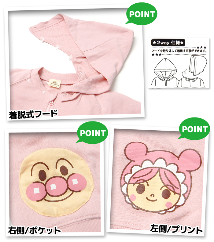 送料無料 男児 女児 ベビー 裏毛 パーカー ジャケット フルジップ アンパンマン アウター 着脱式フード 2way iw-1418 メール便対応