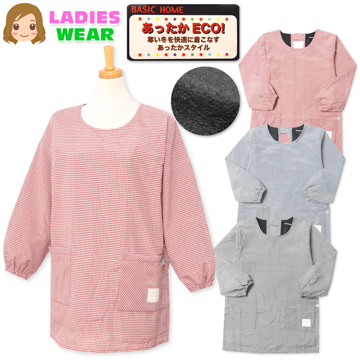 送料無料 婦人 レディース 裏フリース 割烹着 エプロン 防寒 あったか素材 保温性 先染めギンガムチェック 後ろボタン&ひも留め sl-0392 メール便対応