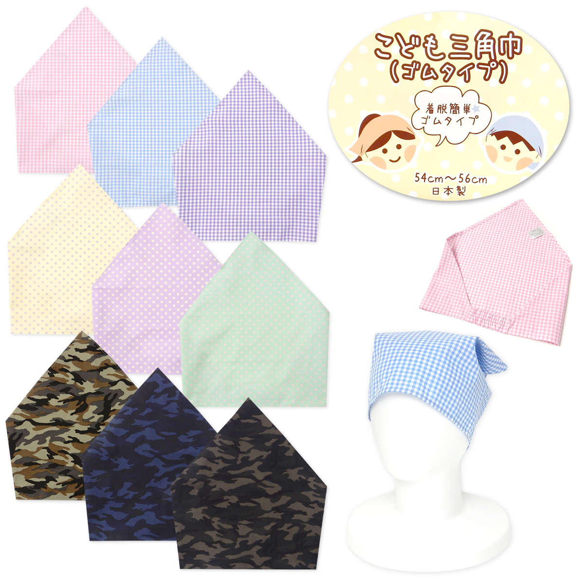 送料無料 男児 女児 キッズ ジュニア 三角巾 ゴムタイプ 着脱簡単 日本製 綿100% 子供 男の子 女の子 54cm〜56cm sl-0548 メール便対応