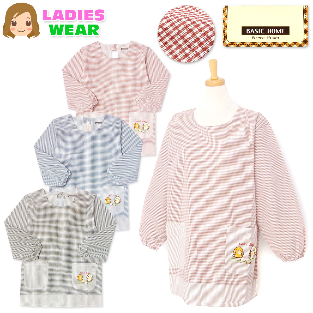送料無料 婦人 レディース 割烹着 エプロン 後ろボタン&ひも留め チェック柄 ストライプ切替 うさぎ sl-0640 メール便対応