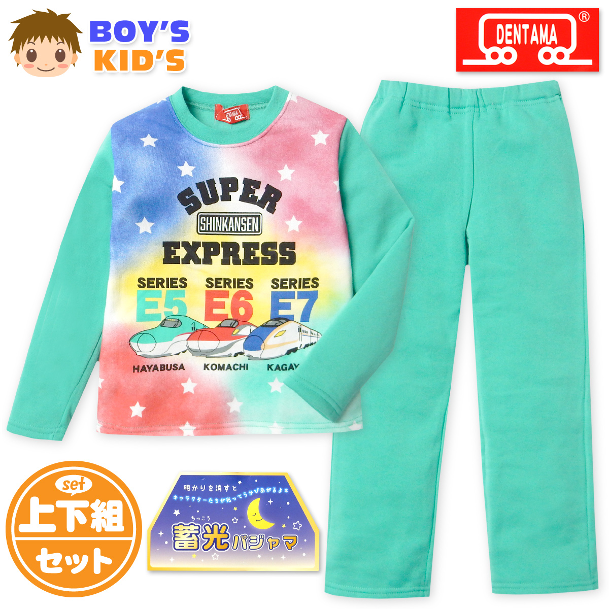 送料無料 男児 キッズ 裏起毛 長袖 光るパジャマ でんたま 新幹線 上下組 あったか 保温 蓄光 子供服 男の子 td-0851 メール便対応